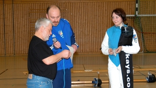 In Anwesenheit des Zeuthener Bürgermeisters Klaus DieterKubick, welcher zum Abschluss als "Glücksfee" fungierend den Gewinnerdes vom Fechtclub gestifteten Preises ermittelte, sahen die Zuschauerein spannendes Mannschaftsgefecht der Cottbuser Jugendlichen. Dass es amEnde 44:44 stand, war laut Aussage des Damen- und des Herrenteams purerZufall. Fechtuntypisch gab es im Gefecht keinen Sieger. Als Gewinnerdes Tages durfte sich aber Marvin Kootz fühlen, der am Ende derVeranstaltung den Preis, ein Übungsflorett mit Tragetasche, mit nachHause nehmen durfte. Er wird es gut gebrauchen können, gehört er dochzu den 50 Teilnehmern, die gleich nach den Osterfeiertagen mit demAnfängerkurs beginnen werden.